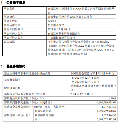 中国经济网北京12月11日讯今日,农银汇理基金管理有限公司发布农银汇理中证同业存单AAA指数7天持有期证券投资基金基金合同生效公告。