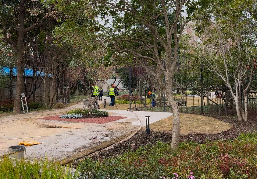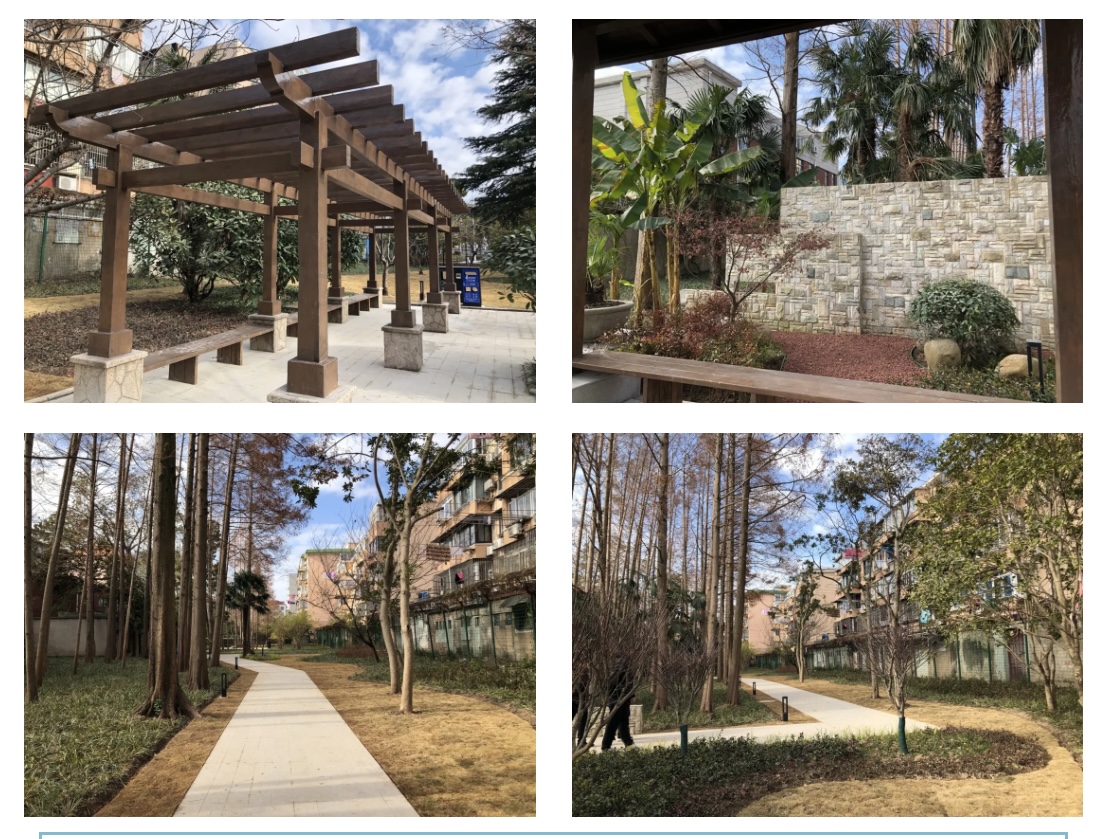 ,2024年8月,施工人员在夏日顶着烈日酷暑在栈道上进行施工,把破损的木栅道、木栏杆拆除,改为花岗岩材质铺装;修缮了园内两处廊架,同时增设垃圾桶、座椅、庭院灯等设施设备。秋冬时节还对绿化进行了修剪,移植影响居民生活的青桐、水杉、广玉兰等乔木,补种红枫、金桂、柳叶马鞭草、南天竹、金边阔叶麦冬、吉祥草、紫花翠芦莉、兰花三七等低矮植被,解决居民遮阴采光问题,提升园内绿化景观面貌。宝林五村居民罗先生表示:“这次改建之后,我觉得非常好,平时也多了一个好去处,能够在这里休息。”,