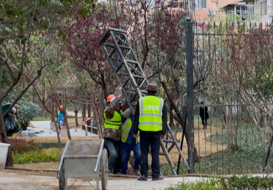 2024年8月,施工人员在夏日顶着烈日酷暑在栈道上进行施工,把破损的木栅道、木栏杆拆除,改为花岗岩材质铺装;修缮了园内两处廊架,同时增设垃圾桶、座椅、庭院灯等设施设备。秋冬时节还对绿化进行了修剪,移植影响居民生活的青桐、水杉、广玉兰等乔木,补种红枫、金桂、柳叶马鞭草、南天竹、金边阔叶麦冬、吉祥草、紫花翠芦莉、兰花三七等低矮植被,解决居民遮阴采光问题,提升园内绿化景观面貌。宝林五村居民罗先生表示:“这次改建之后,我觉得非常好,平时也多了一个好去处,能够在这里休息。”