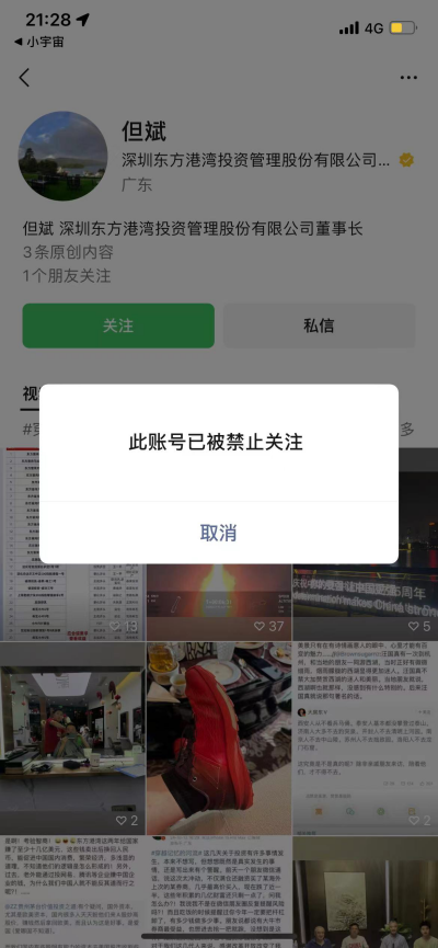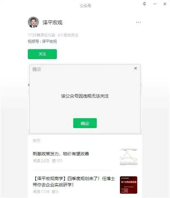 两人的争执以“被禁”而告一段落。10月15日晚,但斌的视频号被“禁止关注”,而任泽平的微信公众号“泽平宏观”也显示“该公众号因违规无法关注”。