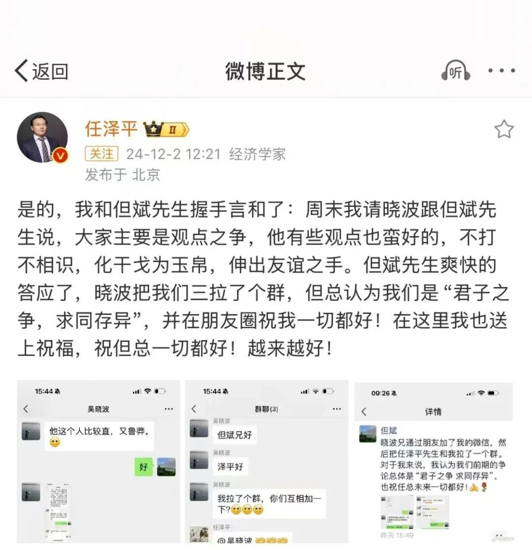 “网红”经济学家任泽平也发布微博称,自己与但斌握手言和了。12月2日,任泽平在微博发文称:“我和但斌先生握手言和了,周末我请晓波跟但斌先生说,大家主要是观点之争,他有些观点也蛮好的,不打不相识,化干戈为玉帛,伸出友谊之手。但斌先生爽快地答应了······祝但总一切都好!越来越好!”