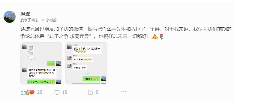 日前,东方港湾创始人但斌在社交平台发文称:“晓波兄通过朋友加了我的微信,然后把任泽平先生和我拉了一个群。对于我来说,我认为我们(自己与任泽平)前期的争论是‘君子之争,求同存异’。祝任总未来一切都好。”