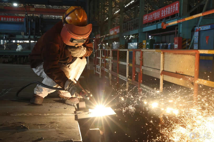 2025-01-03 14:59:00 来源:上观新闻2025年1月2日早晨,沪东中华造船制造二部的黄立花准备开工,开启新一年首块平板的焊接。