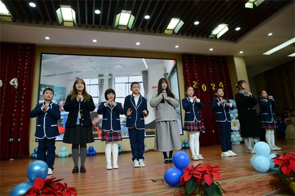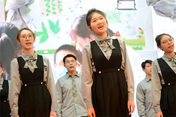 随后,学校团员教师用歌声献礼学校20周年庆。青年教师们一曲《You are my sunshine》,用温情的曲调表达了对学校栽培的感谢,令现场观众如沐暖阳。