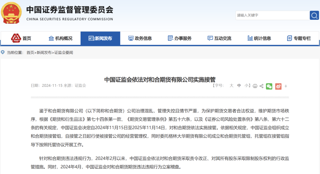 证监会称,鉴于和合期货公司治理混乱,管理失控且情节严重,为保护期货交易者合法权益,维护期货市场秩序,证监会决定自2024年11月15日至2025年11月14日,对和合期货依法实施接管。