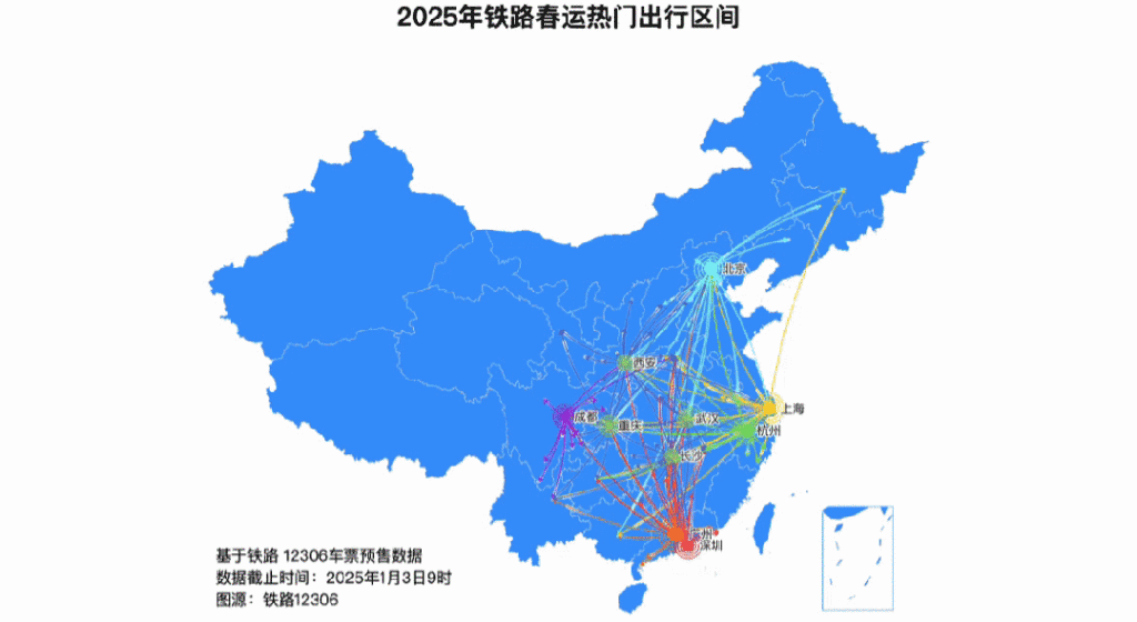 从2024年12月31日至1月3日9时车票预售情况来看,热门出发城市主要有广州、北京、上海、深圳、杭州、成都、重庆、武汉、西安、长沙;热门到达城市主要有北京、成都、广州、重庆、上海、武汉、西安、长沙、郑州、哈尔滨;北京至哈尔滨、广州至长沙、北京至上海、广州至武汉、广州至重庆、深圳至长沙、深圳至武汉、北京至西安、沈阳至哈尔滨等热门区间客流相对集中。
