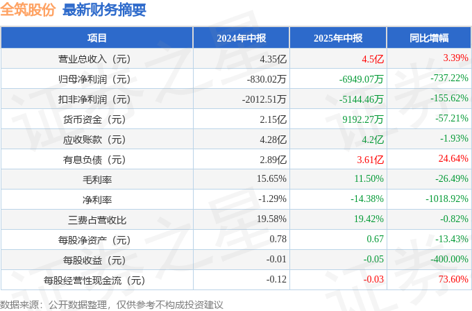 据证券之星公开数据整理,近期全筑股份(603030)发布2025年中报。截至本报告期末,公司营业总收入4.5亿元,同比上升3.39%,归母净利润-6949.07万元,同比下降737.22%。按单季度数据看,第二季度营业总收入2.38亿元,同比上升0.79%,第二季度归母净利润-5033.09万元,同比下降377.58%。本报告期全筑股份公司应收账款体量较大,当期应收账款占最新年报营业总收入比达53.7%。
