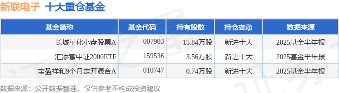 持有新联电子最多的基金为长城量化小盘股票A,目前规模为0.81亿元,最新净值1.3776(8月15日),较上一交易日上涨0.84%,近一年上涨30.43%。该基金现任基金经理为雷俊。